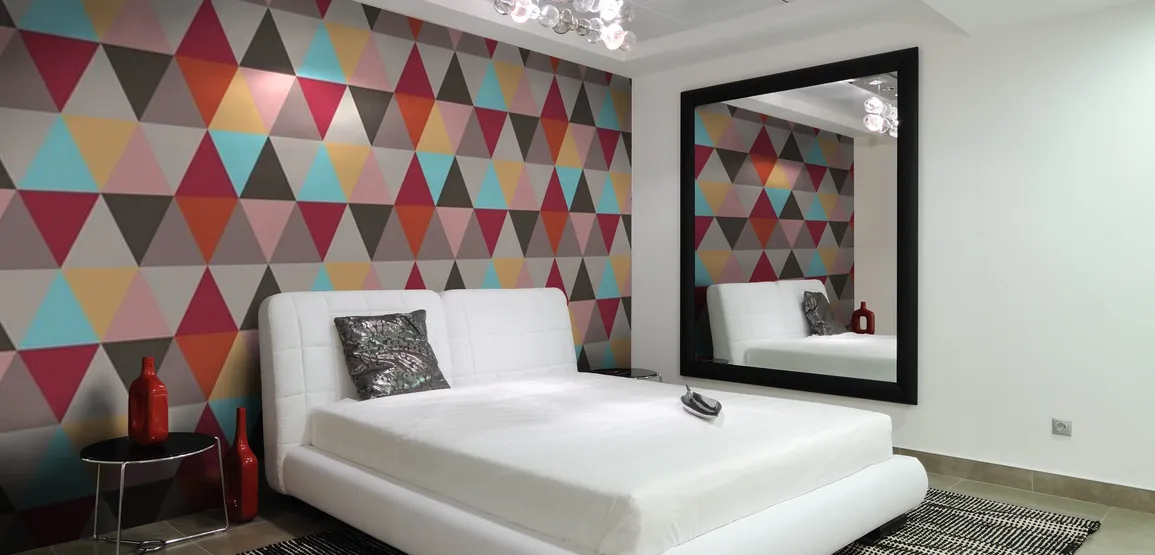 Креативные личности не пройдем мимо обоев с геометрическим рисунком. И правильно. Они отвечают последним требованиям моды. Самые разные узоры, особенно живые 3д-картинки, способны превратить вашу спальню в старинный замок или космическое пространство. Здесь можем дать совет, не увлекаться и оклеивать все стены, достаточно одной. Обычно это у основания кровати или стена справа или слева от нее. Сочетайте яркие броские обои с однотонными спокойными цветами. Геометрический дизайн обоев для спальни для активных людей
